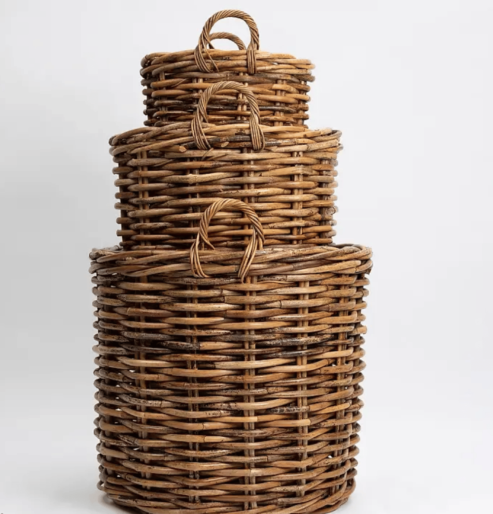 Big, bold and handsome, our chunky round baskets are hand crafted using super tough jumbo cane and up for almost any task. Sure to make a serious statement.
